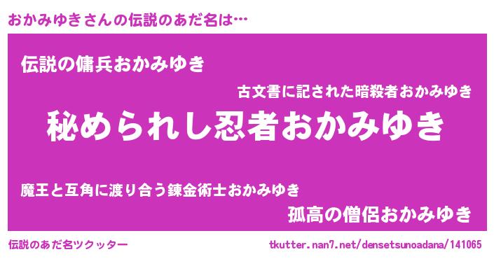 | 男性向けラノベタイトル風あだ名 | 『オカミユキスレイヤー』 |
