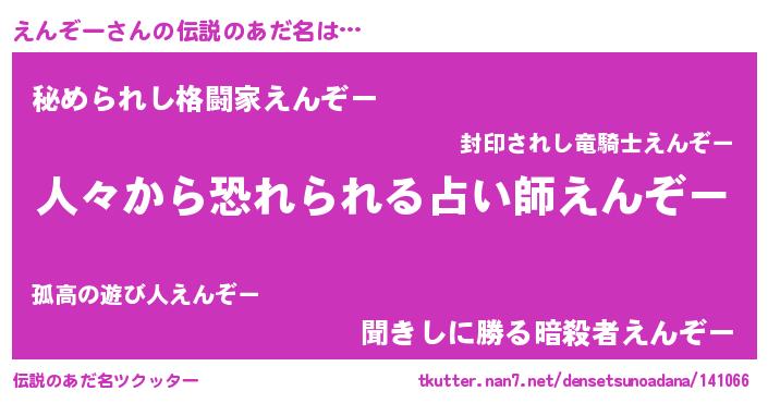 | 男性向けラノベタイトル風あだ名 | 『おまえをオタクにしてやるから、俺をえんぞーにしてくれ! 』 |
