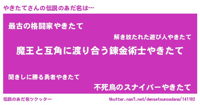 | 女子向けラノベタイトル風あだ名 | 『やきたて恋絵巻』『やきたて伯爵の花嫁』 |