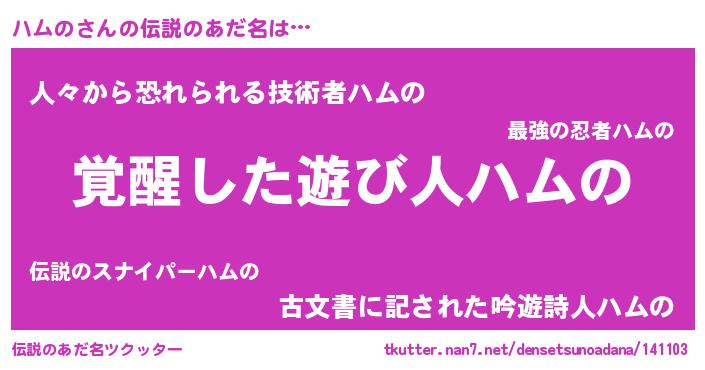 | 男性向けラノベタイトル風あだ名 | 『ハムのに滅ぼされるだけの簡単なお仕事です』 |