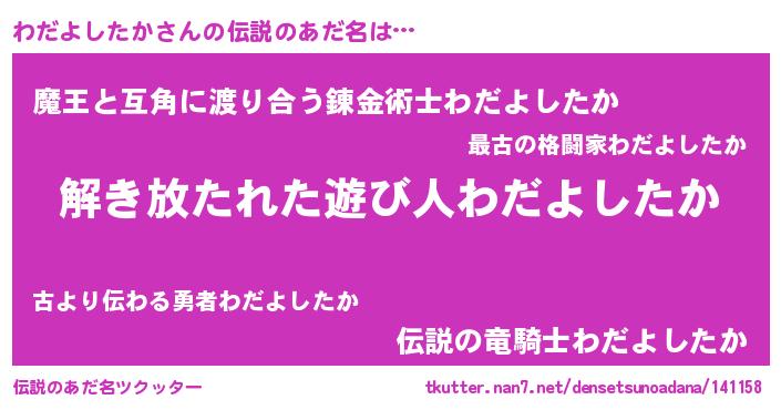 | 男性向けラノベタイトル風あだ名 | 『わだよしたかの嫁は女の子じゃないと思った?』 |