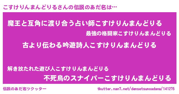 | 女子向けラノベタイトル風あだ名 | 『こすけりんまんどりるの契約王妃』 |