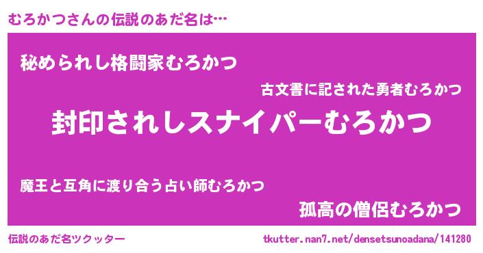 | 男性向けラノベタイトル風あだ名 | 『むろかつに滅ぼされるだけの簡単なお仕事です』 |