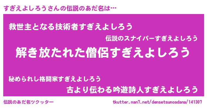 | 男性向けラノベタイトル風あだ名 | 『すぎえよしろうの嫁は女の子じゃないと思った?』 |