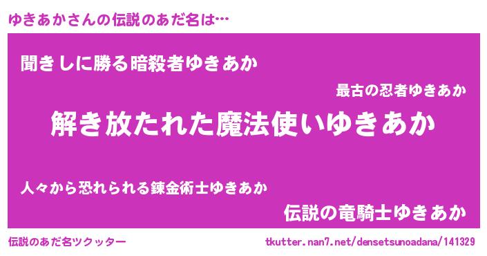 | ヒーロー風カッコイイあだ名 | 『魔戒騎士ユキ』『ネオユキアカ』 |