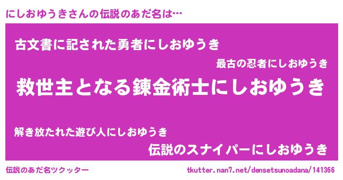 | 男性向けラノベタイトル風あだ名 | 『ノーゲーム・ノーニシオユウキ』 |