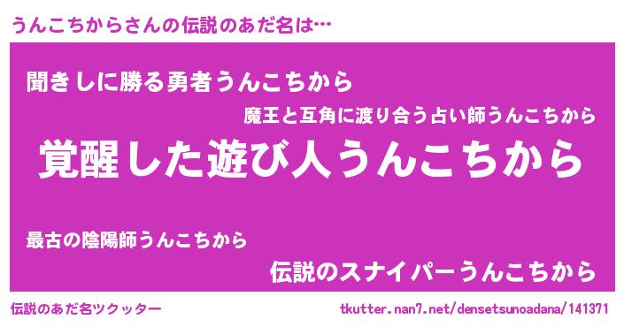| ヒーロー風カッコイイあだ名 | 『究極戦士ウンコチカラ』『暗黒騎士ウン』 |
