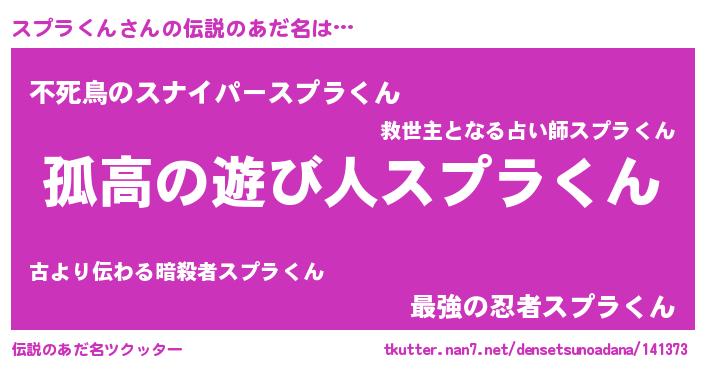 | 男性向けラノベタイトル風あだ名 | 『魔弾の王とスプラくん』 |