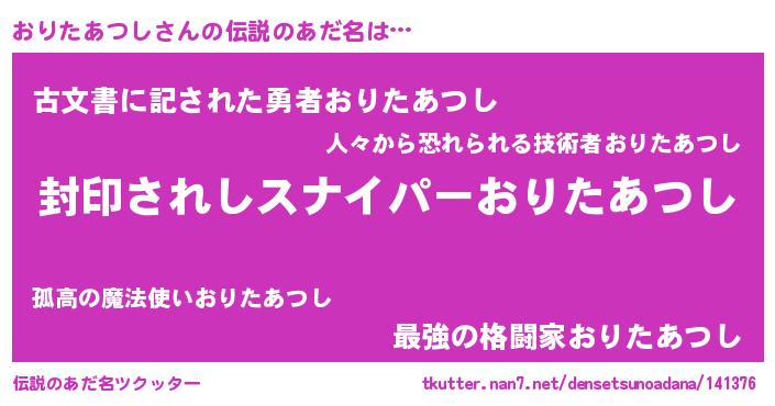 | 胡散臭い通販商品みたいなあだ名 | 『億万長者になれる霊験あらたかなお札…その名も「おりたあつし」』 |