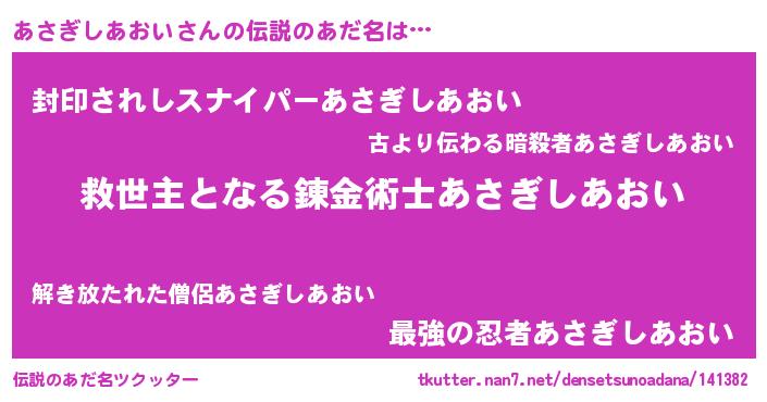 | 男性向けラノベタイトル風あだ名 | 『あさぎしあおい~年齢イコール彼女いない歴の魔法使い~』 |