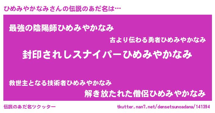 | 男性向けラノベタイトル風あだ名 | 『ひめみやかなみ~年齢イコール彼女いない歴の魔法使い~』 |