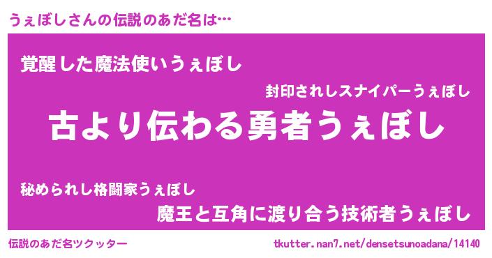 | 男性向けラノベタイトル風あだ名 | 『魔弾の王とうぇぼし』 |