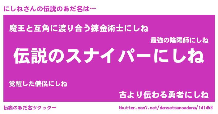 | ヒーロー風カッコイイあだ名 | 『スーパーニシネ』『正義の使者にしね』 |