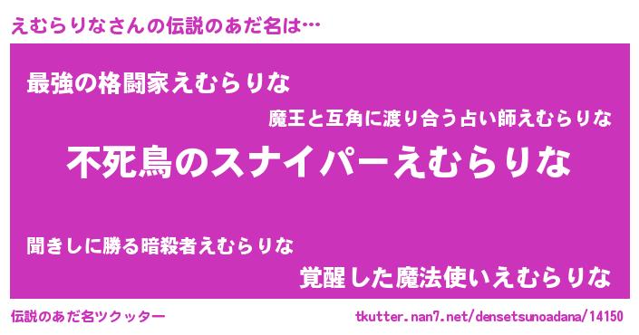 | 男性向けラノベタイトル風あだ名 | 『Re:えむらりなから始める異世界生活』 |