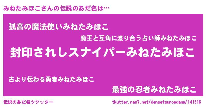 | 意味不明あだ名 | 『自称みねたみほこ』 |