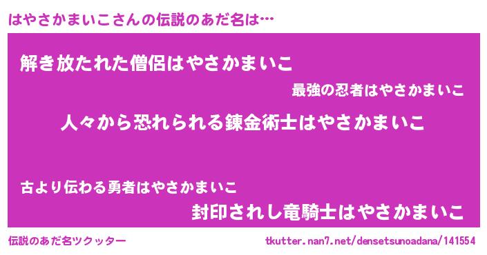 | 男性向けラノベタイトル風あだ名 | 『魔弾の王とはやさかまいこ』 |