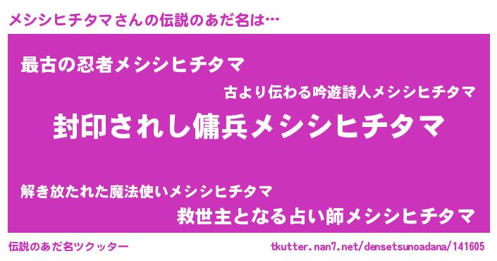 | 男性向けラノベタイトル風あだ名 | 『Re:メシシヒチタマから始める異世界生活』 |