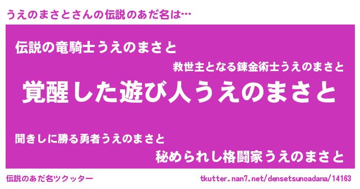 | 男性向けラノベタイトル風あだ名 | 『うえのまさとの嫁は女の子じゃないと思った?』 |