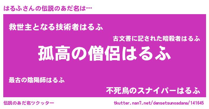 | ヒーロー風カッコイイあだ名 | 『暗黒騎士ハル』『天空の使者はるふ』 |