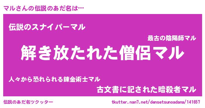 | 男性向けラノベタイトル風あだ名 | 『ダンジョンにマルを求めるのは間違っているだろうか』 |
