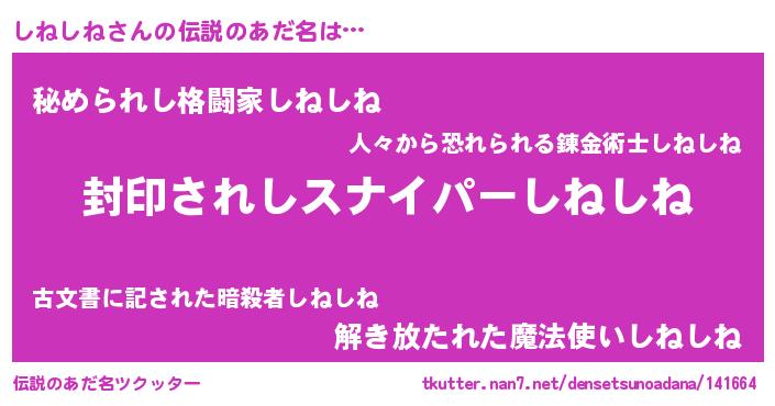 | ヒーロー風カッコイイあだ名 | 『スーパーシネシネ』『魔戒騎士シネ』 |