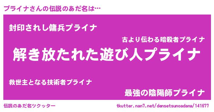 | 男性向けラノベタイトル風あだ名 | 『プライナの嫁は女の子じゃないと思った?』 |