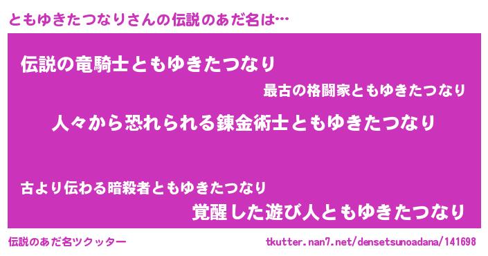 | 女子向けラノベタイトル風あだ名 | 『ともゆきたつなりなんてお断りですっ。』 |