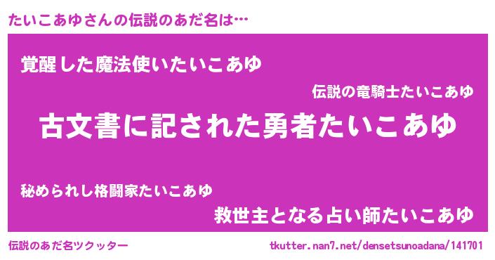 | 男性向けラノベタイトル風あだ名 | 『誰もが恐れるあのたいこあゆが、ぼくの専属メイドになるようです。』 |