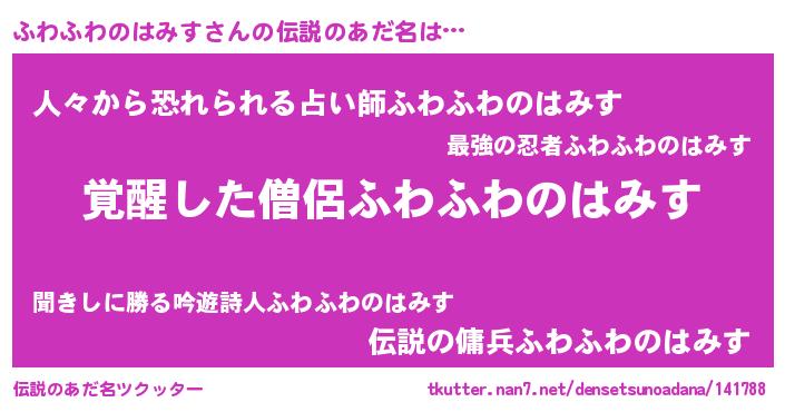 | 女子向けラノベタイトル風あだ名 | 『ふわふわのはみす様がみてる』 |