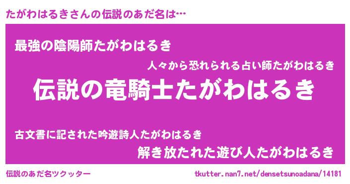 | 胡散臭い通販商品みたいなあだ名 | 『必ず成功するブレスレット…その名も「たがわはるき」』 |