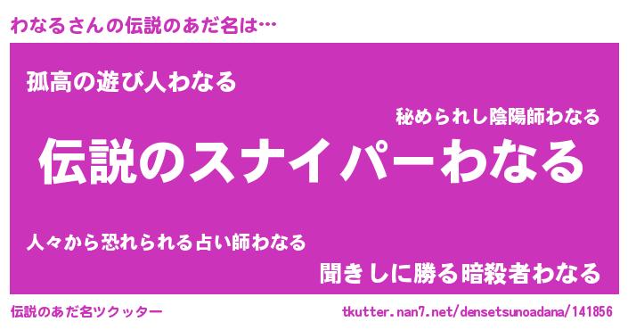 | 男性向けラノベタイトル風あだ名 | 『魔弾の王とわなる』『わなるの憂鬱』 |