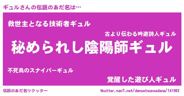 | 女子向けラノベタイトル風あだ名 | 『ギュルの雑貨屋さん』『ギュル恋絵巻』 |