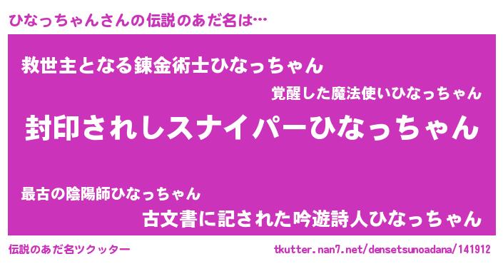 | 男性向けラノベタイトル風あだ名 | 『Re:ひなっちゃんから始める異世界生活』 |