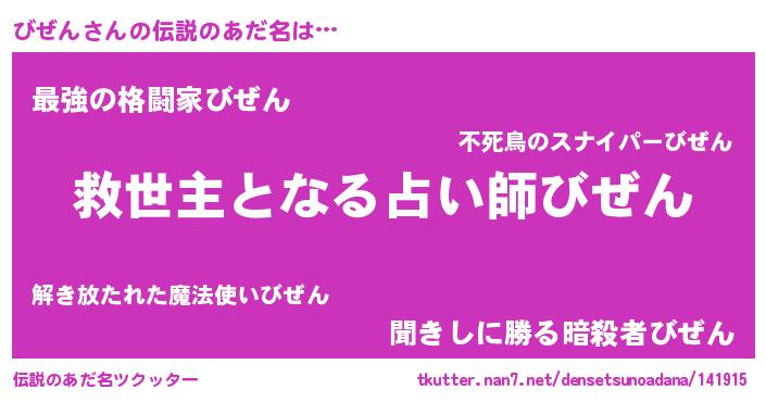 | 女子向けラノベタイトル風あだ名 | 『死神びぜんの再婚』『びぜんの婚約者』 |