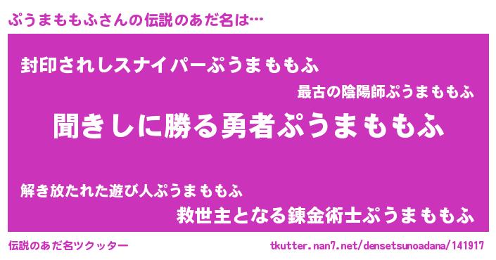 | 男性向けラノベタイトル風あだ名 | 『ぷうまももふという概念が存在しない退屈な世界 』 |