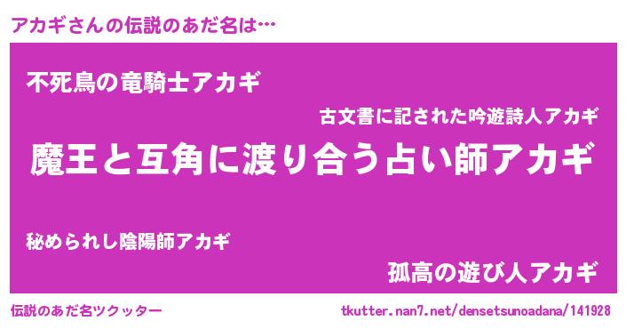 | 女子向けラノベタイトル風あだ名 | 『アカギ恋絵巻』『アカギ姫と円卓の騎士』 |