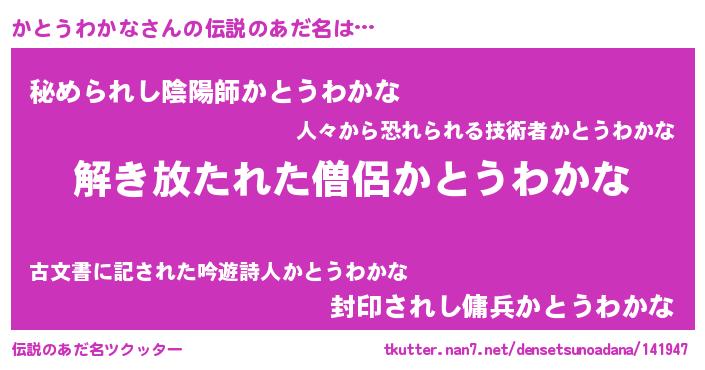 | 意味不明あだ名 | 『とにかく怪しいかとうわかな』 |