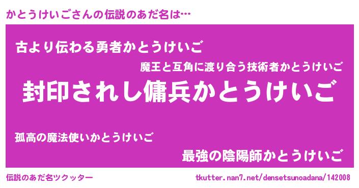| ヒーロー風カッコイイあだ名 | 『スーパーカトウケイゴ』『暗黒騎士カト』 |