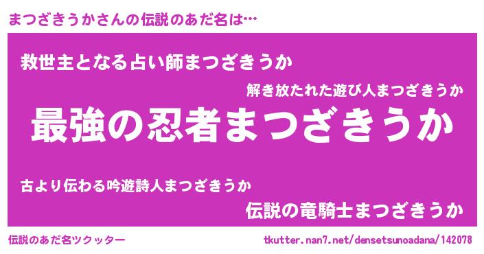 | 男性向けラノベタイトル風あだ名 | 『Re:まつざきうかから始める異世界生活』 |