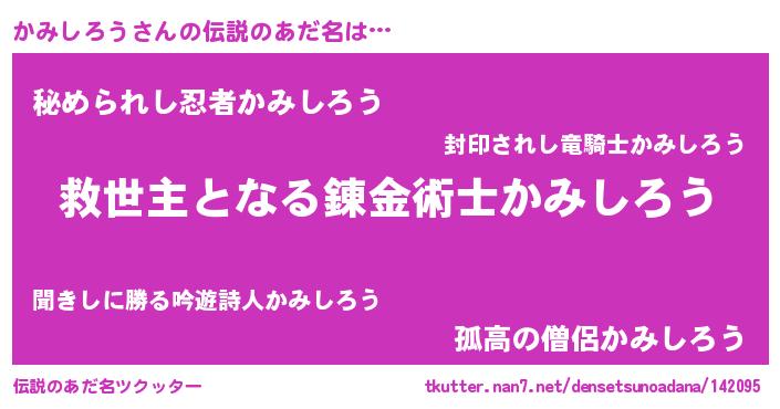 | 男性向けラノベタイトル風あだ名 | 『かみしろうに滅ぼされるだけの簡単なお仕事です』 |