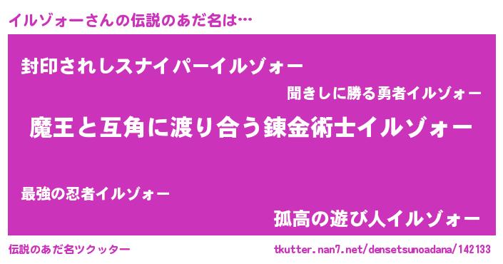 | 女子向けラノベタイトル風あだ名 | 『乙女ゲームの破滅フラグしかない悪役イルゾォーに転生してしまった…』 |
