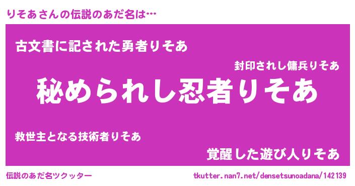 | 意味不明あだ名 | 『自称りそあ』『めかぶ科りそあ属』 |