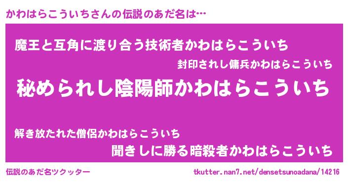 | 男性向けラノベタイトル風あだ名 | 『魔弾の王とかわはらこういち』 |