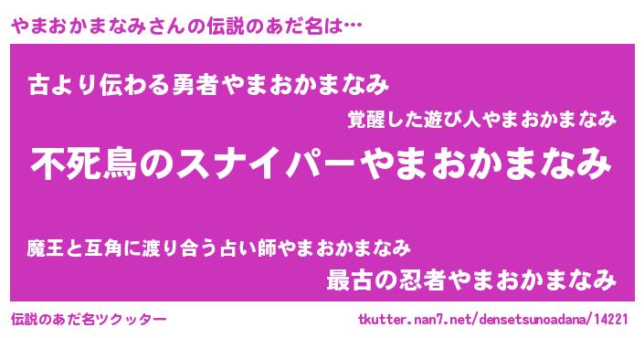 | 胡散臭い通販商品みたいなあだ名 | 『モテモテ間違いなし霊験あらたかなお札…その名も「やまおかまなみ」』 |