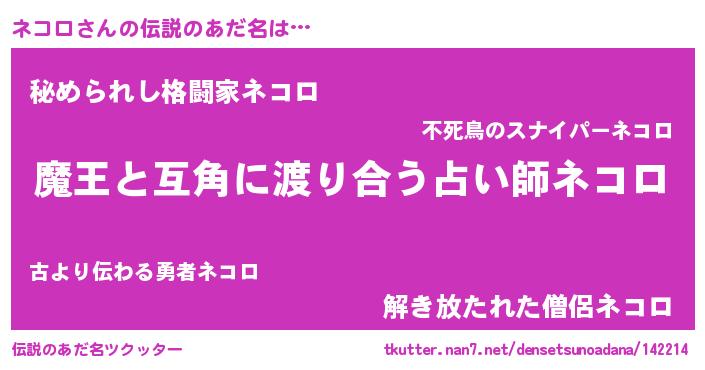 | 男性向けラノベタイトル風あだ名 | 『ノーゲーム・ノーネコロ』 |