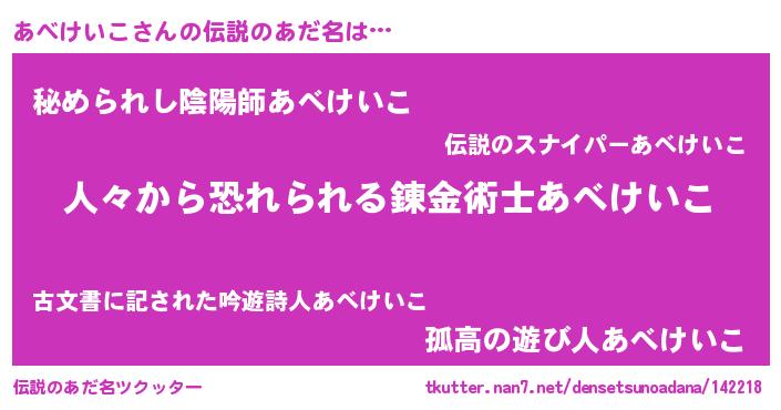 | 男性向けラノベタイトル風あだ名 | 『おまえをオタクにしてやるから、俺をあべけいこにしてくれ! 』 |