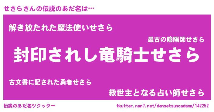| 男性向けラノベタイトル風あだ名 | 『Re:せさらから始める異世界生活』 |