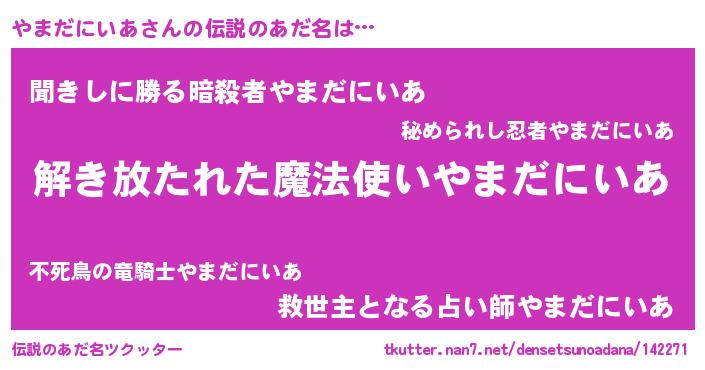 | 男性向けラノベタイトル風あだ名 | 『やまだにいあの嫁は女の子じゃないと思った?』 |