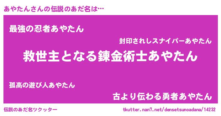 | ヒーロー風カッコイイあだ名 | 『天空の使者あやたん』『仮面アヤダー』 |