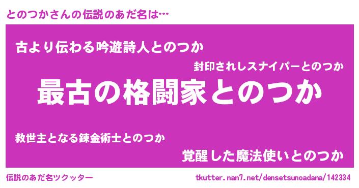 | 男性向けラノベタイトル風あだ名 | 『転生したらとのつかだった件』 |